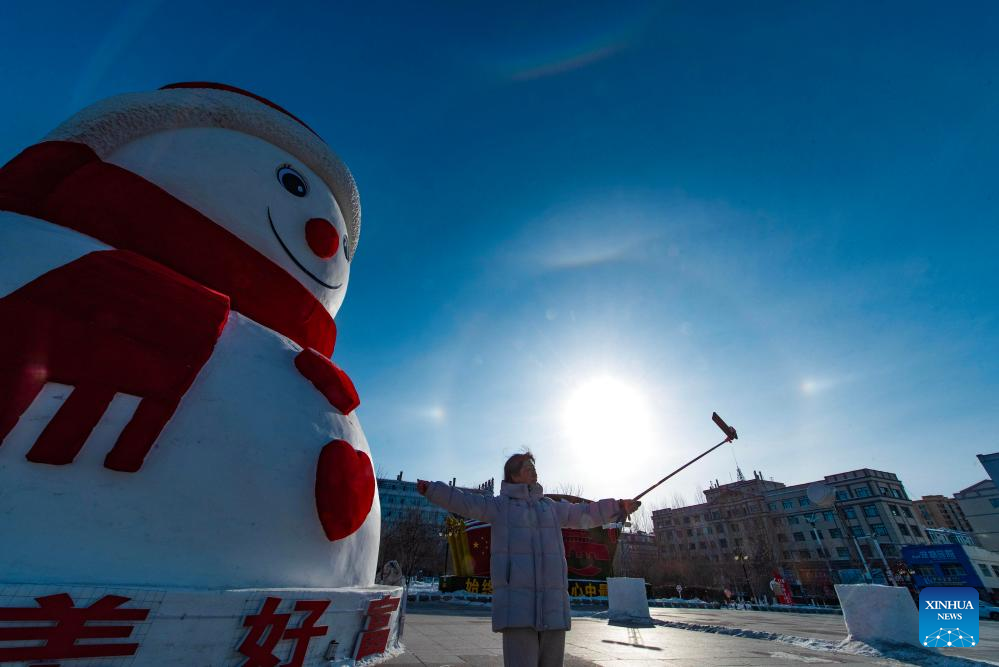 A tourist poses for a selfie with a giant snowman in Fujin City, northeast China's Heilongjiang Province, Jan. 16, 2026. With the arrival of the ice and snow season, various public facilities in Heilongjiang Province have created distinctive snowman-themed landscapes to attract locals and tourists. [Photo/Xinhua]