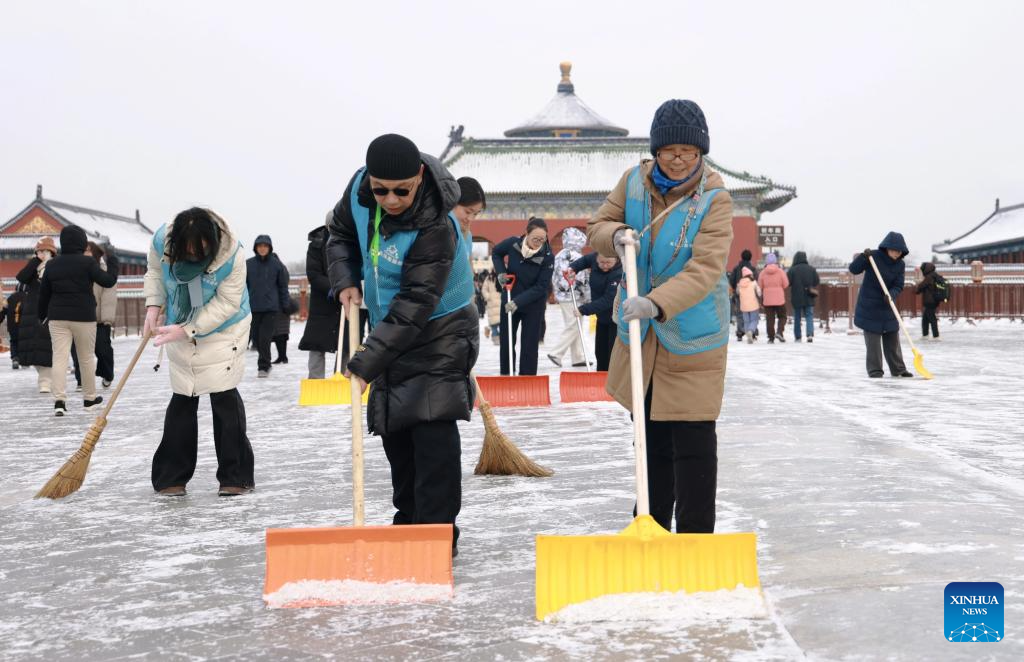 Staff members clear the snow at the Tiantan Park (Temple of Heaven) after a snowfall in Beijing, capital of China, Jan. 18, 2026. Beijing witnessed a snowfall this weekend. (Photo by Zhang Jiang/Xinhua)