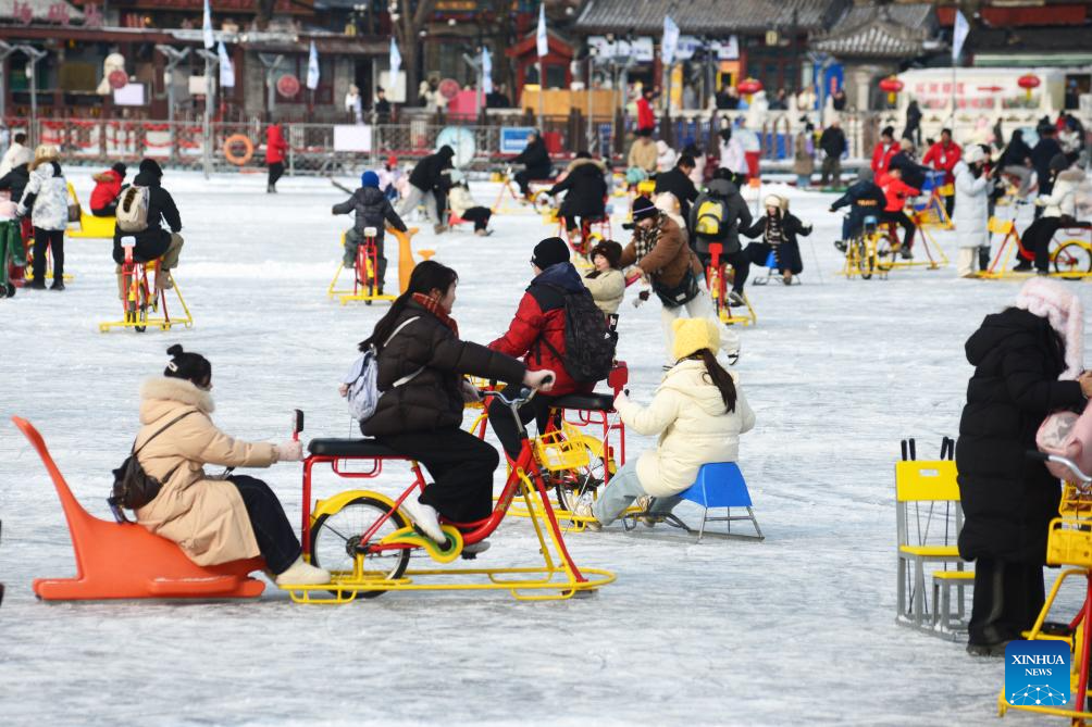 People ride sleds on the frozen Shichahai lake in Beijing, capital of China, Jan. 18, 2026. Beijing witnessed a snowfall this weekend. (Photo by Wang Yuewu/Xinhua)
