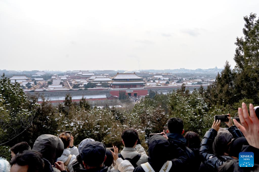 People take photos of the Palace Museum after a snowfall at the Jingshan Park in Beijing, capital of China, Jan. 18, 2026. Beijing witnessed a snowfall this weekend. (Xinhua/Xie Han)