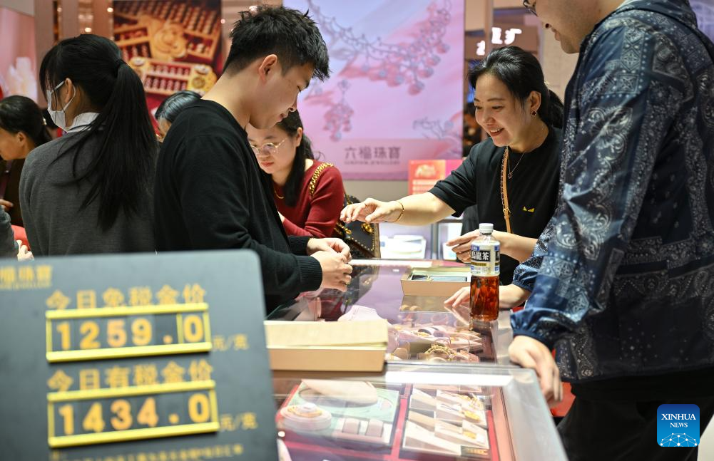 Costumers select gold jewelry at a duty-free store in Haikou, south China's Hainan Province, on Jan. 17, 2026. (Xinhua/Guo Cheng)