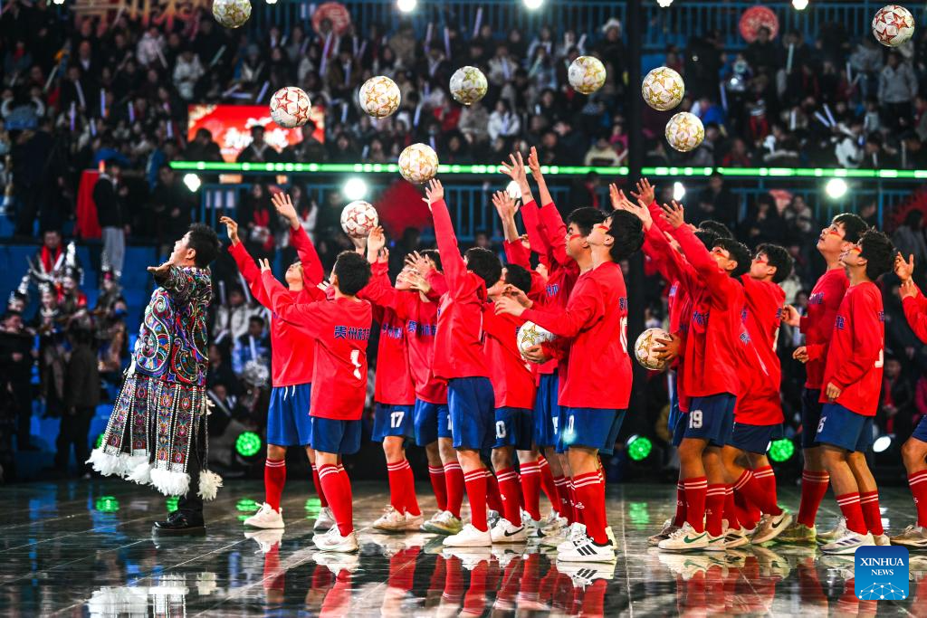Children perform football skills during a "village gala" in Taipan village of Taijiang county, southwest China's Guizhou province, Feb. 3, 2026. [Photo/Xinhua]