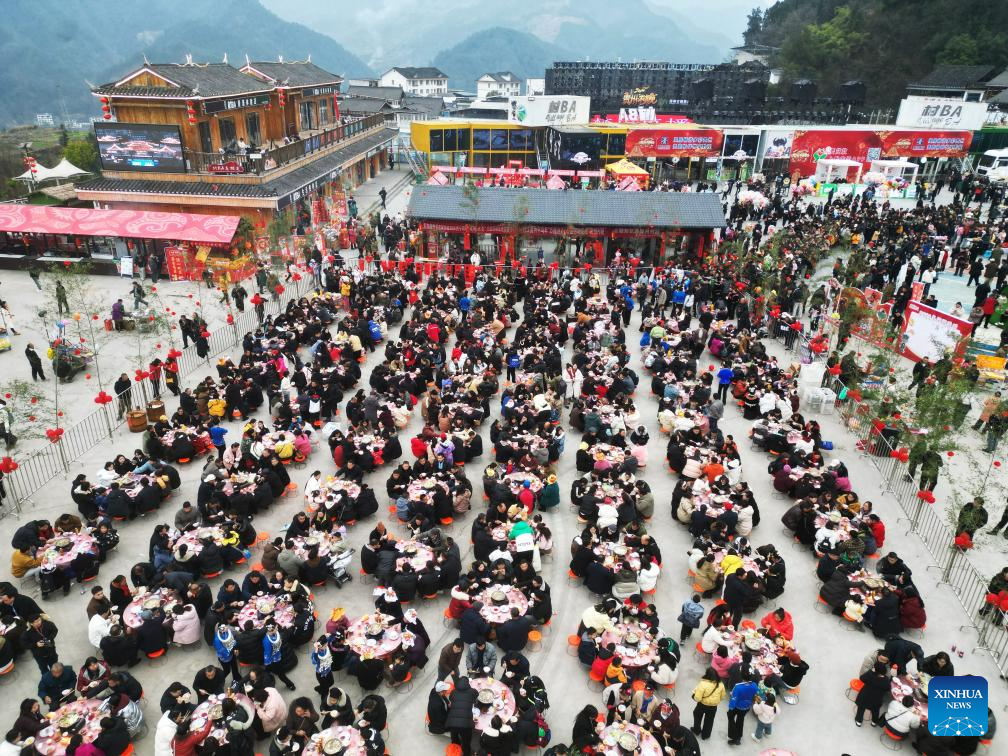 People take part in a long table banquet during a "village gala" in Taipan village of Taijiang county, southwest China's Guizhou province, Feb. 3, 2026. [Photo/Xinhua]