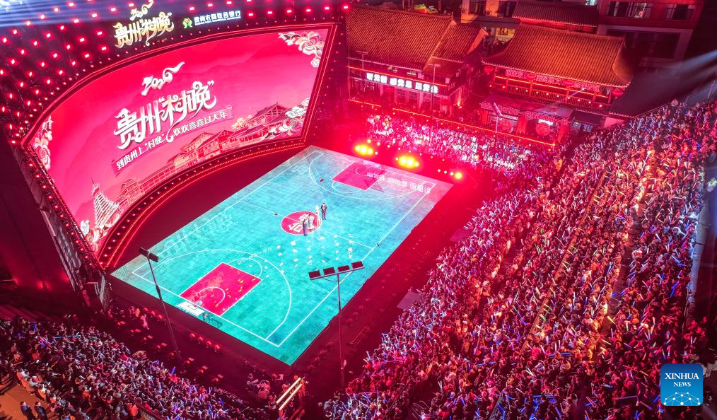 An aerial drone photo shows people watching a "village gala" in Taipan village of Taijiang county, southwest China's Guizhou province, Feb. 3, 2026. [Photo/Xinhua]