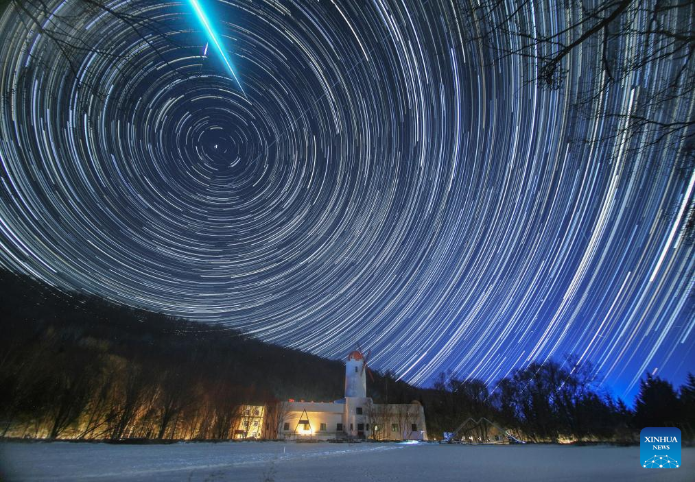 This stack composite photo taken on Dec. 14, 2025 shows the Geminid meteor shower in the sky over Yabuli Ski Resort in Yabuli, northeast China's Heilongjiang province. [Photo/Xinhua]