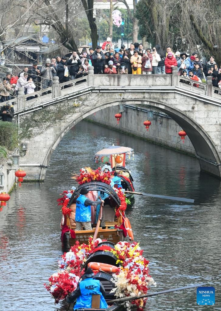 People watch a boat parade in Shaoxing, east China's Zhejiang Province, Feb. 17, 2026. This year's Spring Festival saw a surge of visitors eager to experience local cuisine, rich history and vibrant folk performances. (Xinhua/Weng Xinyang)