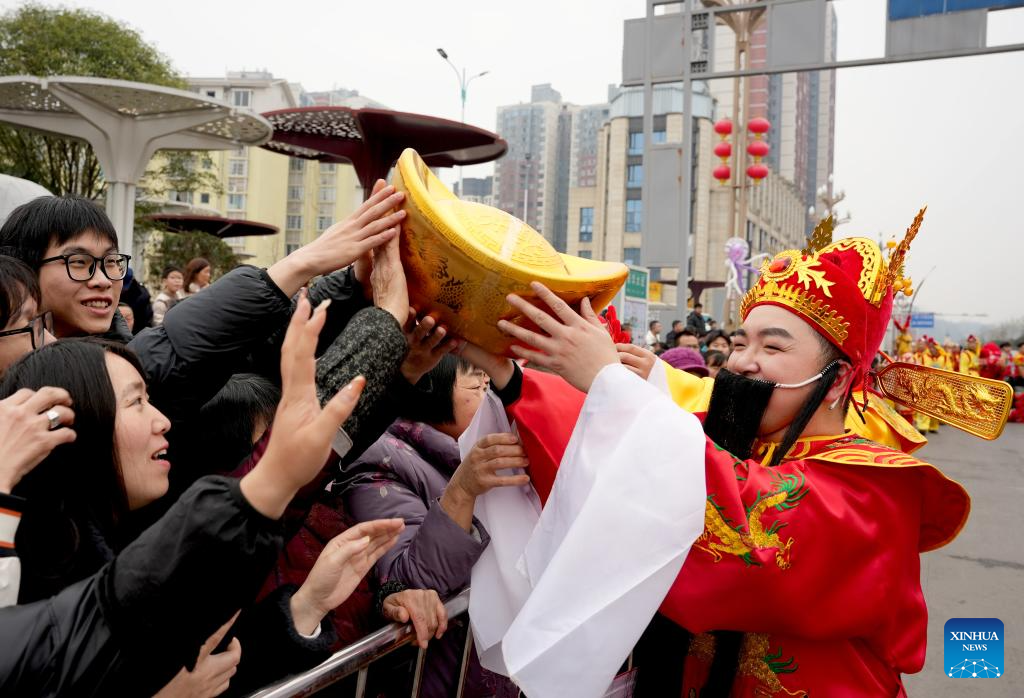 A man dressed as the God of Fortune interacts with visitors in Huaying City, southwest China's Sichuan Province, Feb. 17, 2026. This year's Spring Festival saw a surge of visitors eager to experience local cuisine, rich history and vibrant folk performances. (Photo by Zhou Songlin/Xinhua)