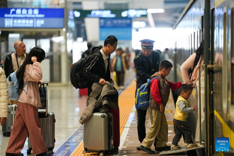 A staff member helps passengers board a train at Guangzhou Baiyun Railway Station in Guangzhou, south China's Guangdong Province, Feb. 19, 2026. During the Spring Festival travel season, civil aviation, railway, and other departments have increased transportation capacity and optimized convenient services such as air-rail intermodal transport, quiet carriages, luggage delivery, and priority channels for vulnerable groups, taking multiple measures to ensure passengers' safe and smooth travel. (Xinhua/Wu Lu)