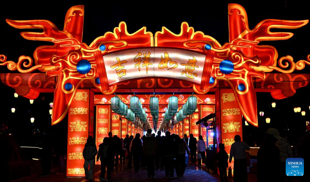 Tourists visit a latern exhibition at a temple fair in Shangqiu City, central China's Henan Province, Feb. 19, 2026. China's Ministry of Culture and Tourism launched a month-long cultural and tourism campaign ahead of the Spring Festival, featuring a wide range of activities and promotional measures to better meet people's needs.