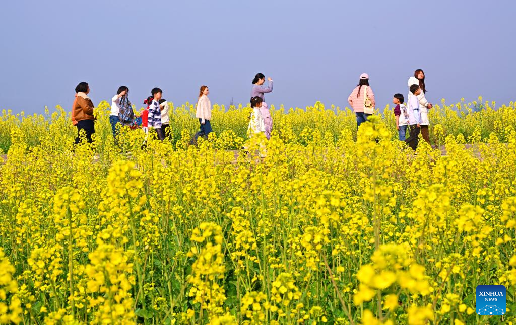 Tourists visit a rapeseed flower field in Tianming Village of Lujia Town, Renshou County, southwest China's Sichuan Province, Feb. 20, 2026. (Photo by Pan Jianyong/Xinhua)