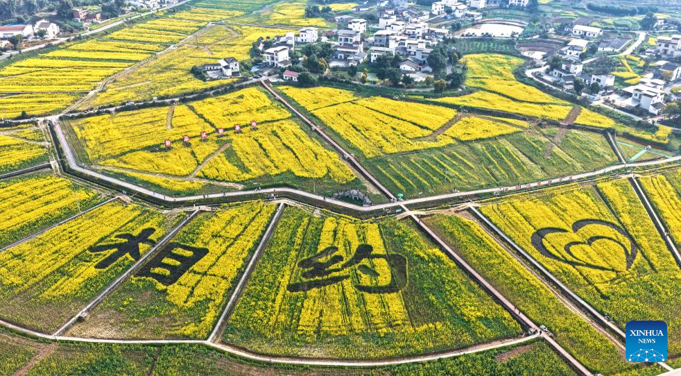 An aerial drone photo taken on Feb. 19, 2026 shows a rapeseed flower field in Tanba Village of Yusi Town, Luxian County, southwest China's Sichuan Province. (Photo by Liu Xueyi/Xinhua)