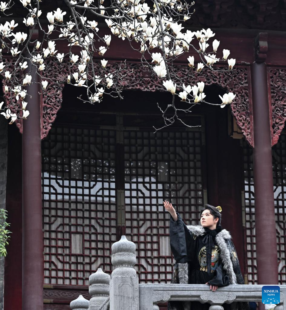 A tourist wearing traditional costume poses for photos with magnolia flowers in Nanjing, east China's Jiangsu province, March 6, 2026. (Photo by Yang Suping/Xinhua)