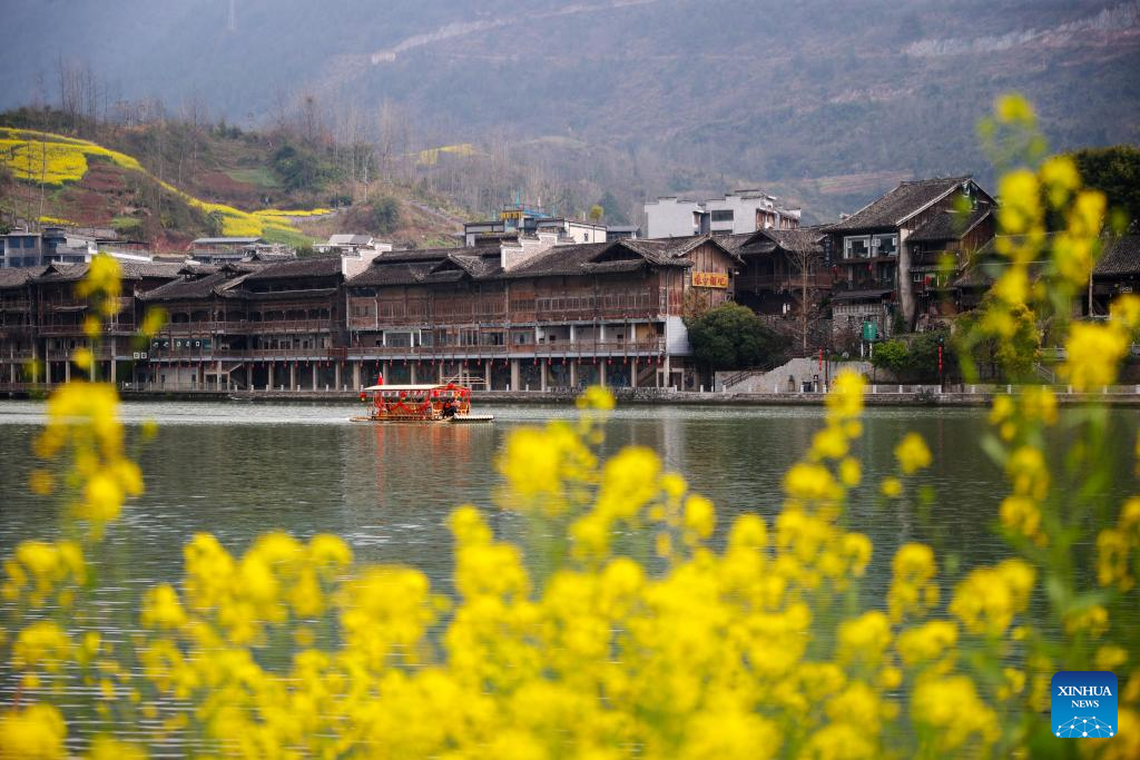 Tourists on a bamboo raft visit Zhuoshui ancient town in Qianjiang District of southwest China's Chongqing, March 6, 2026. (Photo by Yang Min/Xinhua)