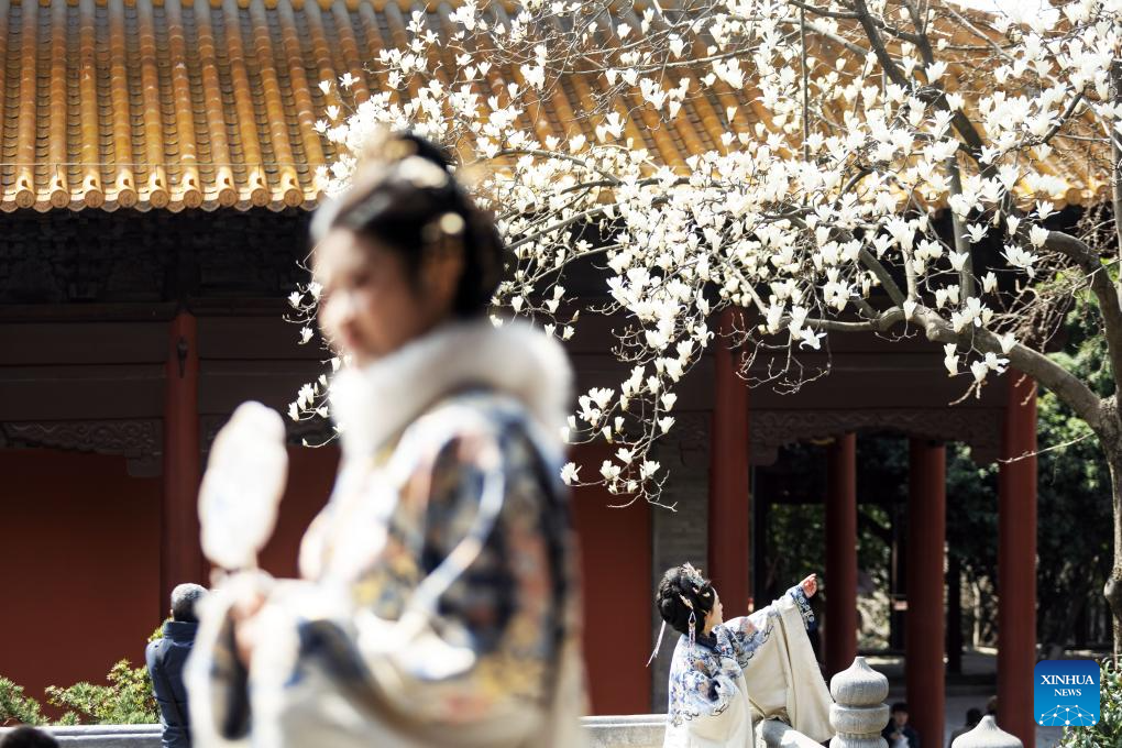 Tourists wearing traditional costumes take photos with magnolia flowers in Nanjing, east China's Jiangsu province, March 7, 2026. (Photo by Sun Zhongnan/Xinhua)