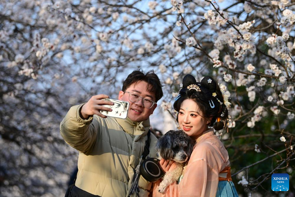 Tourists pose for photos with blooming trees at the Daming Palace National Heritage Park, in Xi'an, northwest China's Shaanxi province, March 9, 2026. Flowers bloom as temperature rises in China. [Photo/Xinhua]