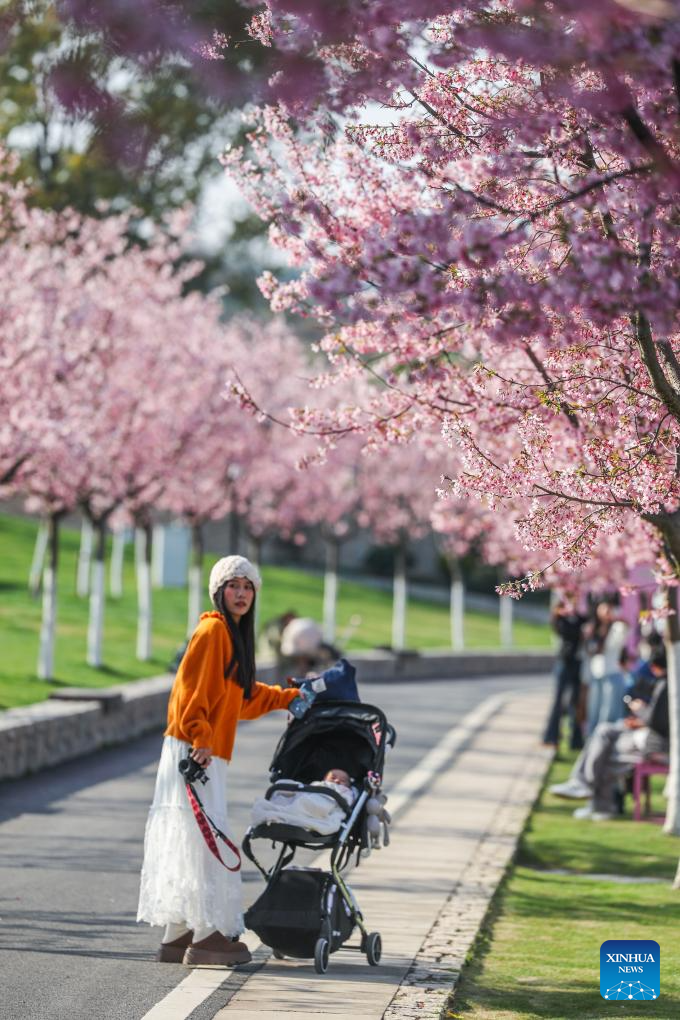 Tourists view cherry blossoms at a scenic area in Jinhua city, Zhejiang province, March 10, 2026. [Photo/Xinhua]