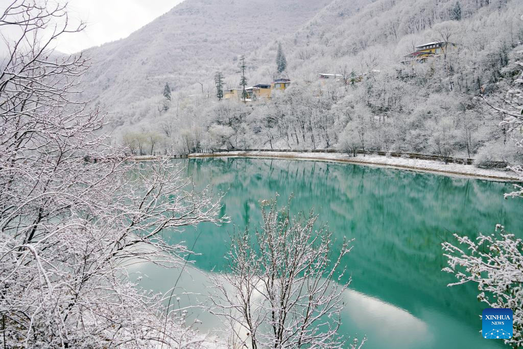 This photo taken on March 18, 2026 shows the scenery after snowfall at Guan'egou scenic area in Dangchang county, Longnan city, Gansu province. [Photo/Xinhua]