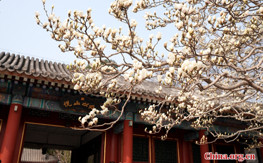 White magnolia blossoms frame an ancient rooftop at the Summer Palace in Beijing, March 24, 2026. [Photo by Xu Xiaoxuan/China.org.cn]