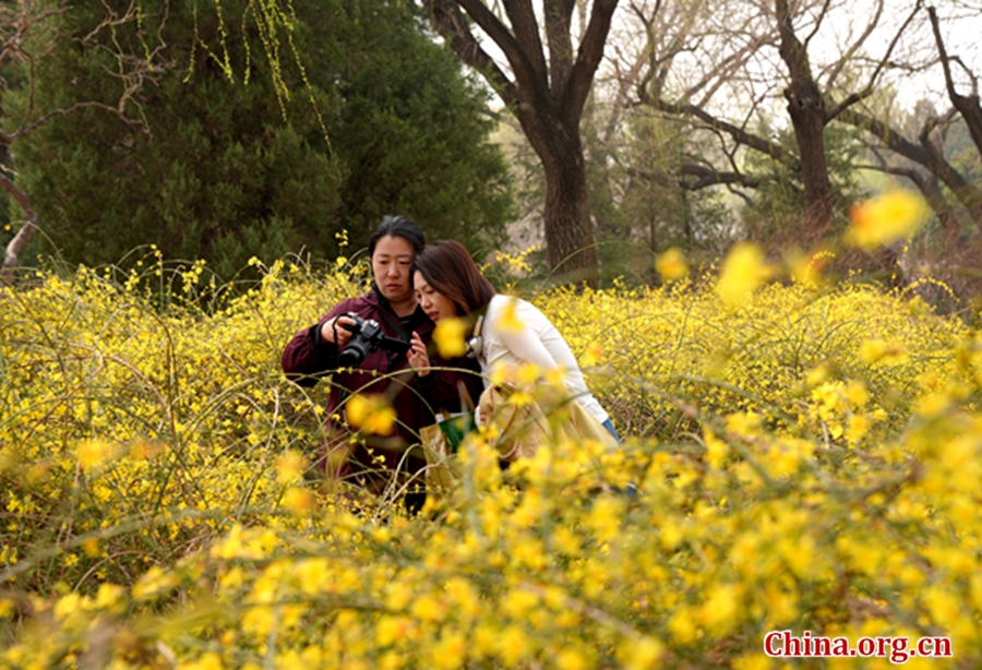 Two visitors review photos taken among winter sweet flowers at the Summer Palace in Beijing, March 24, 2026. [Photo by Xu Xiaoxuan/China.org.cn]