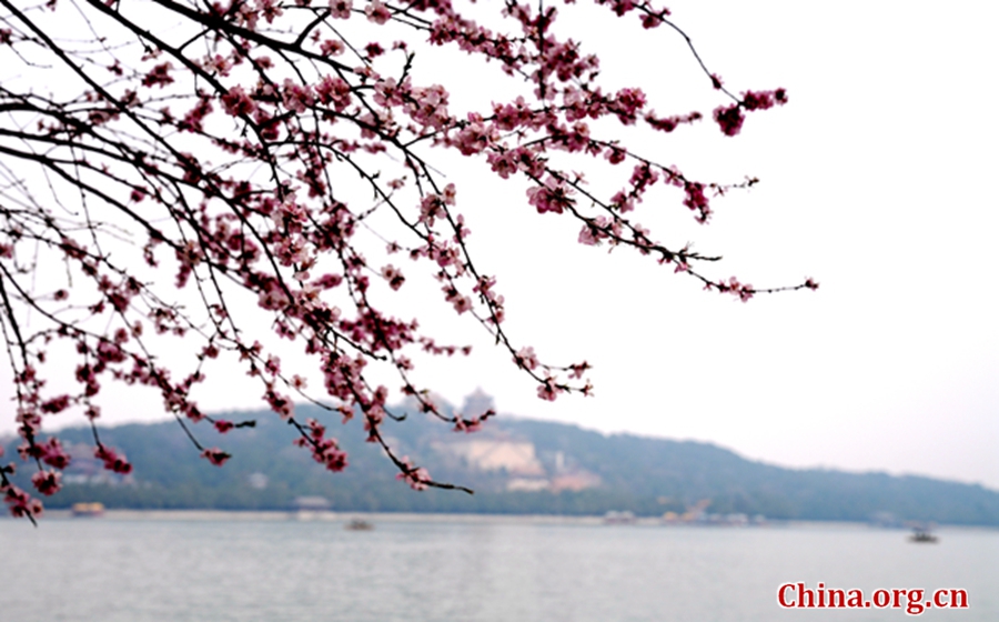 Peach blossoms add a touch of spring color to the distant view of the Tower of Buddhist Incense at the Summer Palace in Beijing, March 24, 2026. [Photo by Xu Xiaoxuan/China.org.cn]