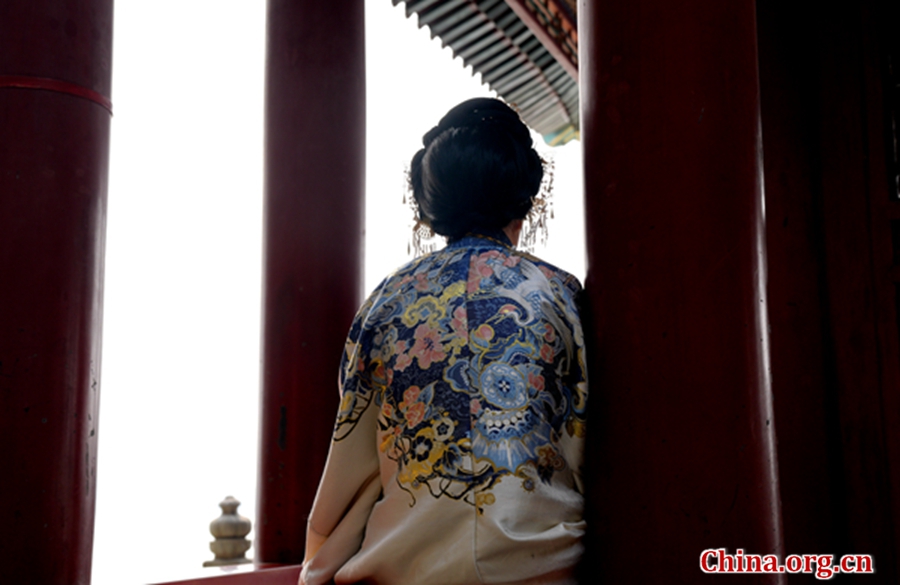 A visitor in Hanfu, or traditional Chinese attire, complete with traditional hair ornaments, sits between red columns at the Summer Palace, March 24, 2026. [Photo by Xu Xiaoxuan/China.org.cn]