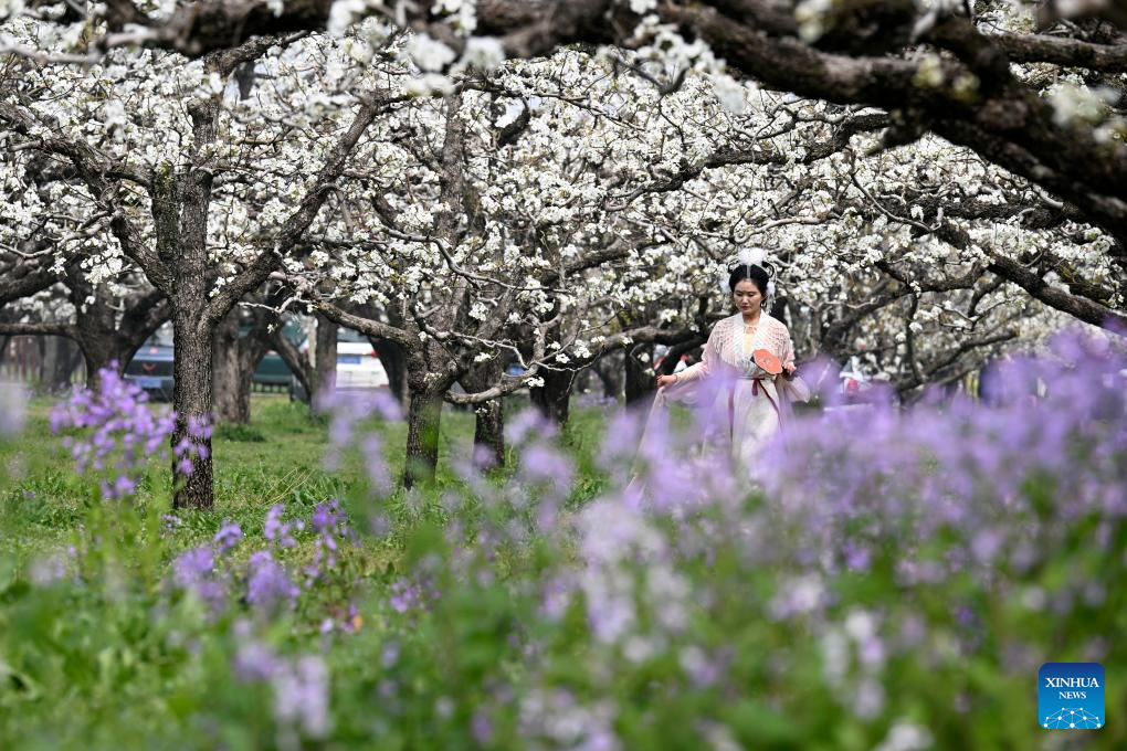 A tourist visits a pear garden in Dangshan County, east China's Anhui Province, March 31, 2026. As pear trees in Dangshan County of Anhui have entered full bloom, various activities are held here to attract tourists. [Photo/Xinhua]