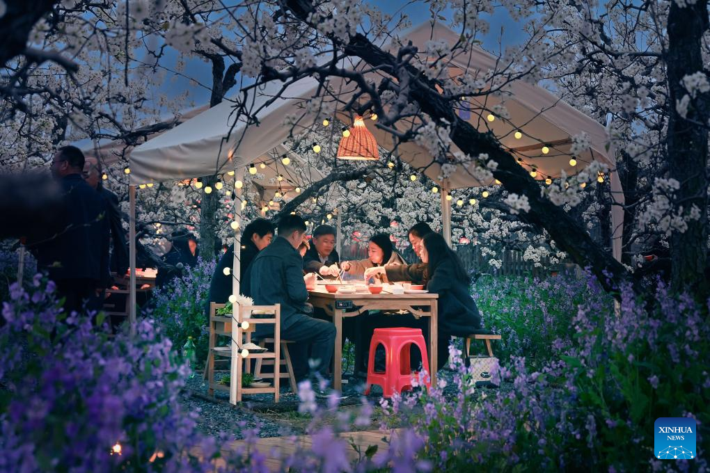 People dine at a pear garden in Dangshan County, east China's Anhui Province, March 30, 2026. As pear trees in Dangshan County of Anhui have entered full bloom, various activities are held here to attract tourists. [Photo/Xinhua]