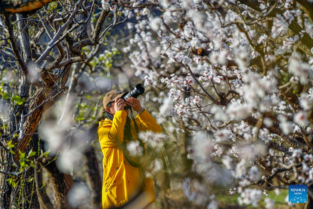 A tourist takes photos of flowers at Changlegu scenic spot in Zunhua City, north China's Hebei Province, April 1, 2026. Spring flowers are blooming across the country, attracting people to enjoy outings and flower viewing. [Photo/Xinhua]