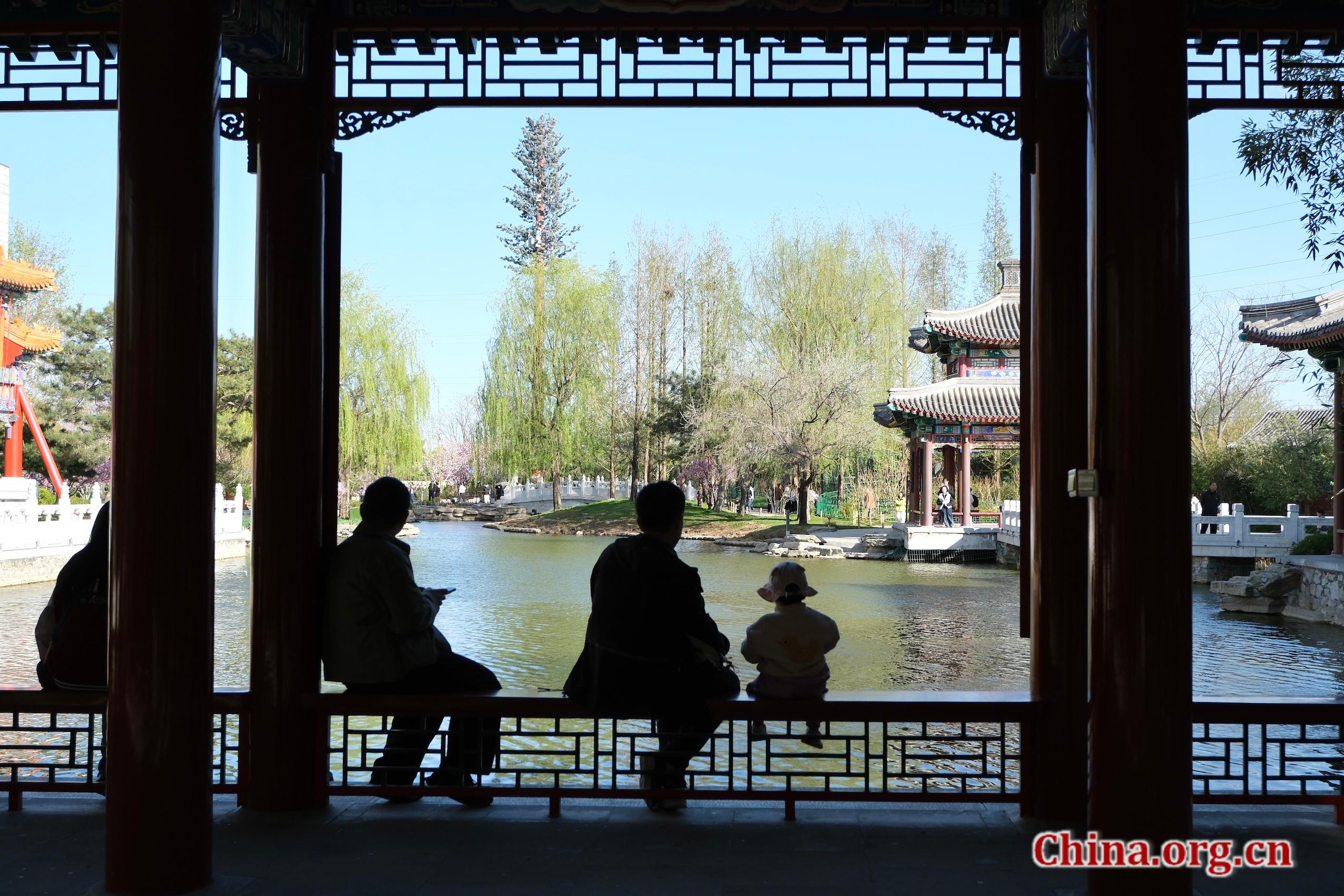 Visitors sit and rest by the lake at the Museum of Chinese Gardens and Landscape Architecture, Beijing, April 5, 2026. [Photo by Liao Jiaxin/China.org.cn]