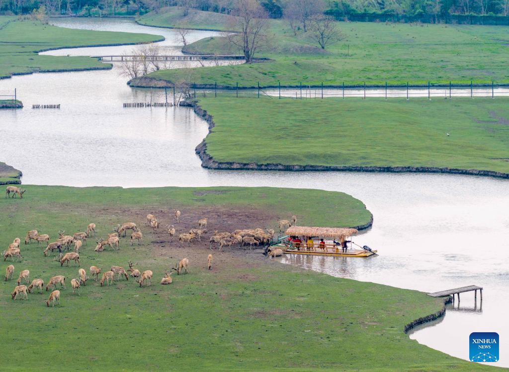 An aerial drone photo taken on April 17, 2026 shows tourists taking a raft interacting with elks at a national wetland park in Jiangyan District of Taizhou City, east China's Jiangsu Province. [Photo by Zhou Shegen/Xinhua]