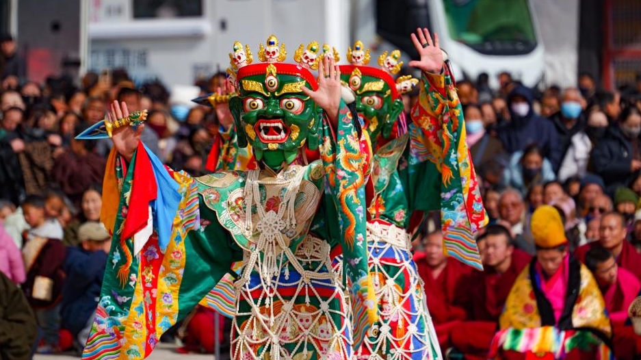 The annual event of exorcism dance to pray for good luck in the new year was held in Xiahe county, Gansu province, on Monday.