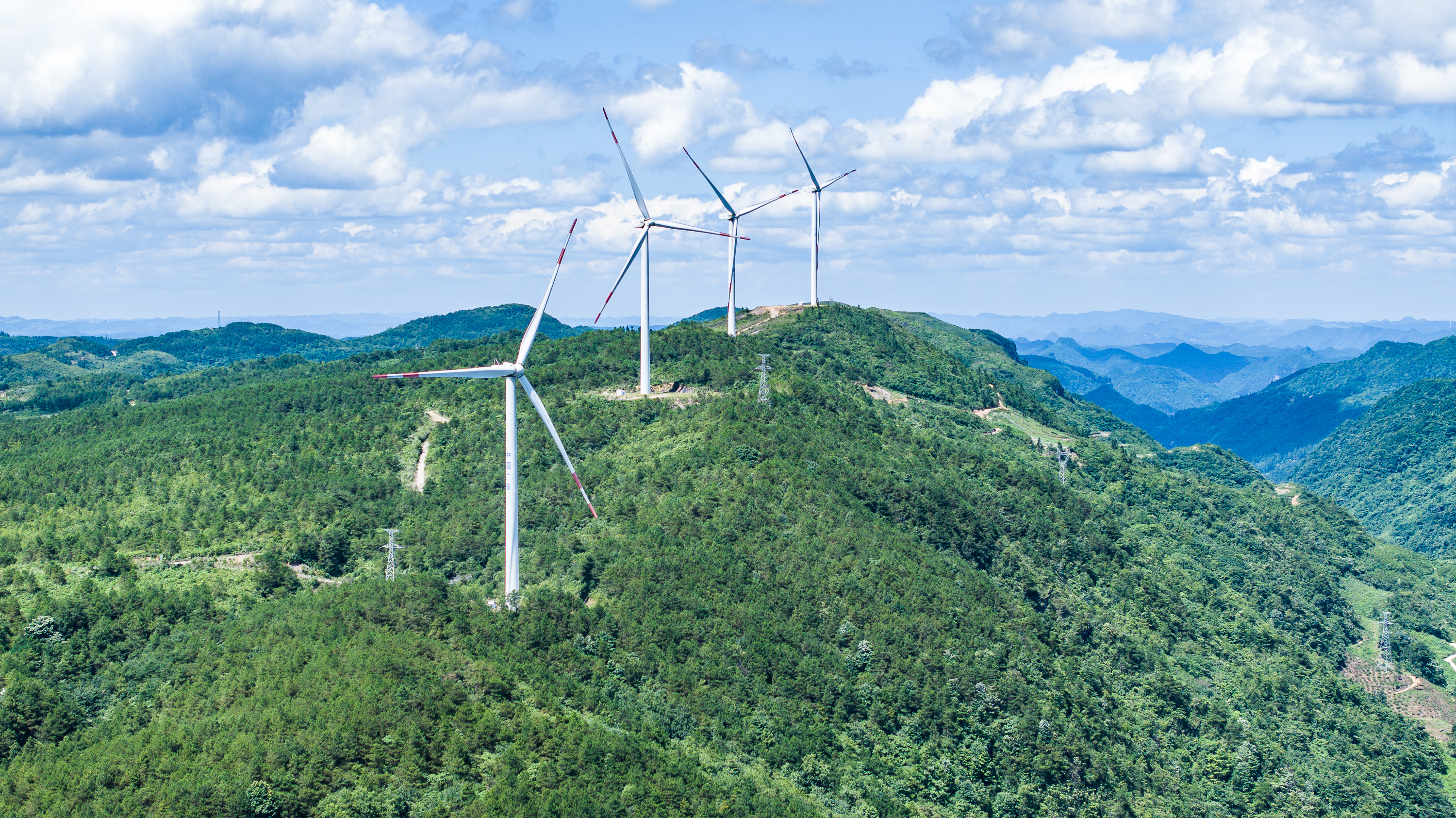 An aerial drone photo taken on July 4, 2025 shows wind turbines in Longli county, southwest China's Guizhou province. [Photo/Xinhua]