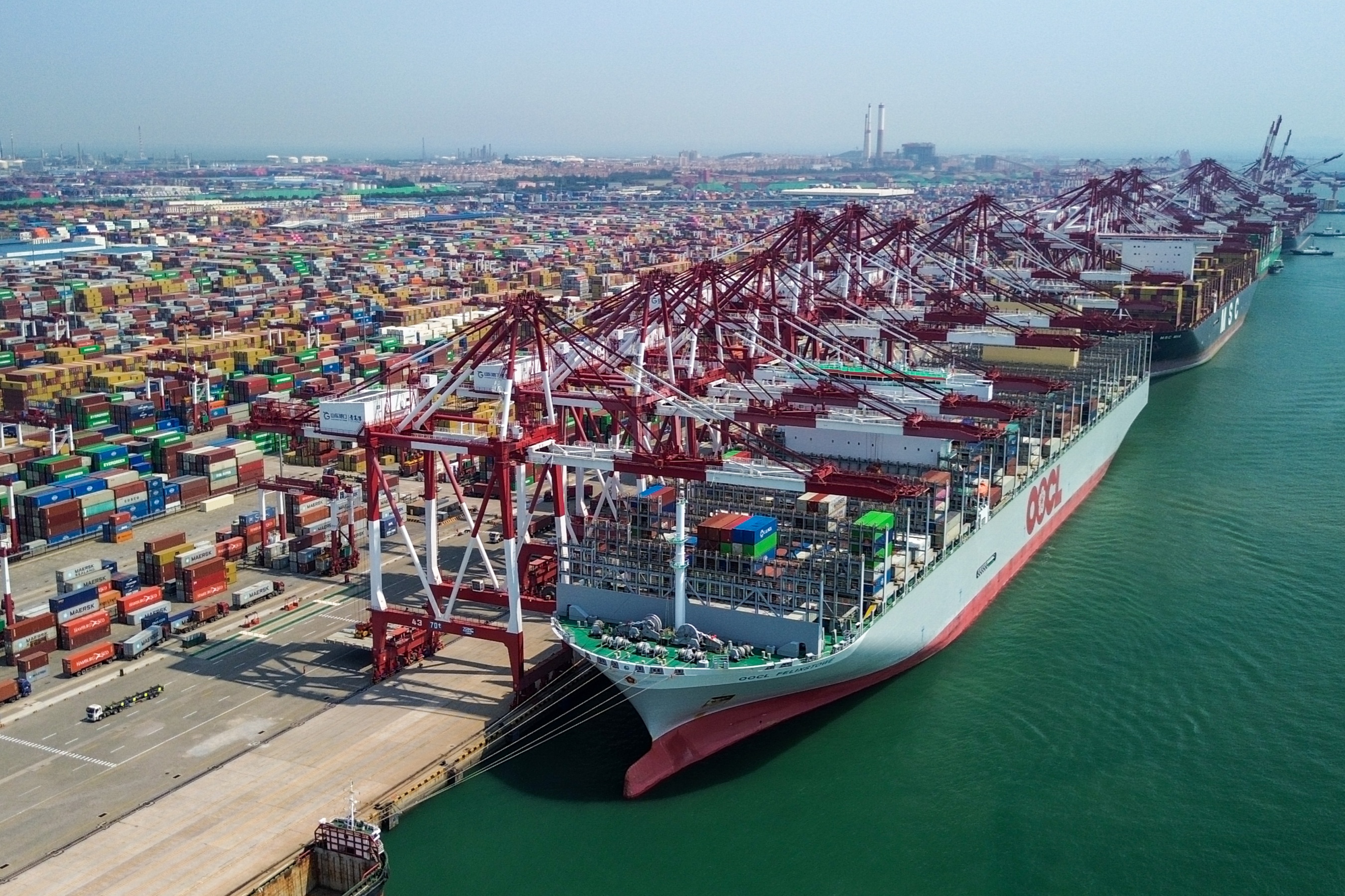 An aerial drone photo taken on May 29, 2025 shows cargo ships berthing at a container dock of Qingdao Port in Qingdao, east China's Shandong province. [Photo/Xinhua]