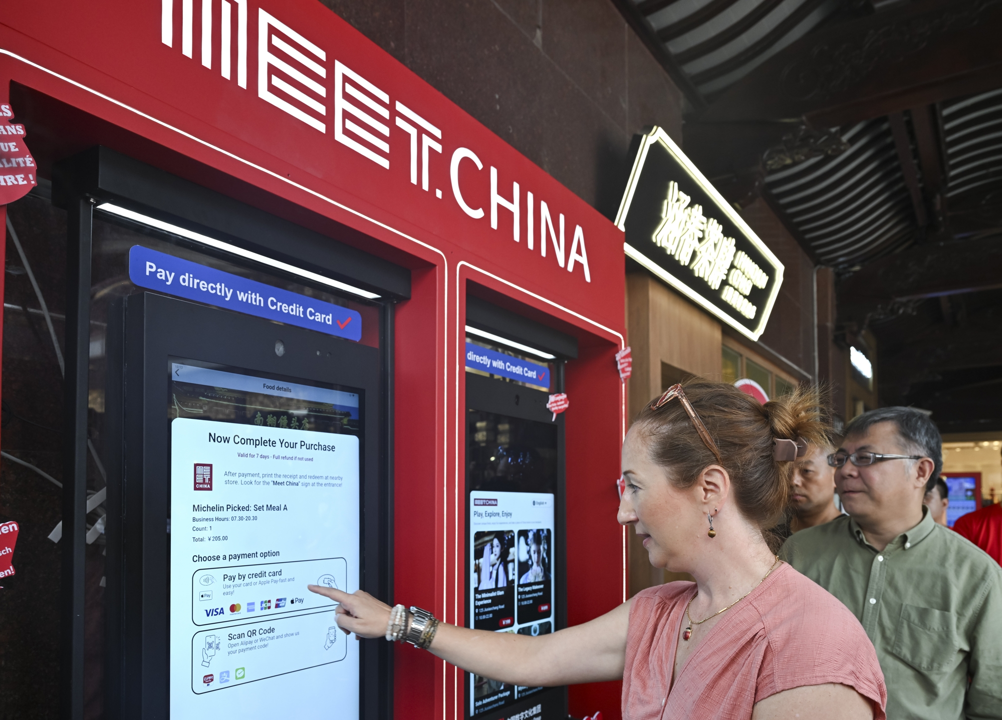 A foreign guest tries to use the "Meet China" Inbound Tourism Digital Consumption Screen in Yuyuan Garden, Shanghai, east China, Sept. 27, 2025. [Photo/Xinhua]
