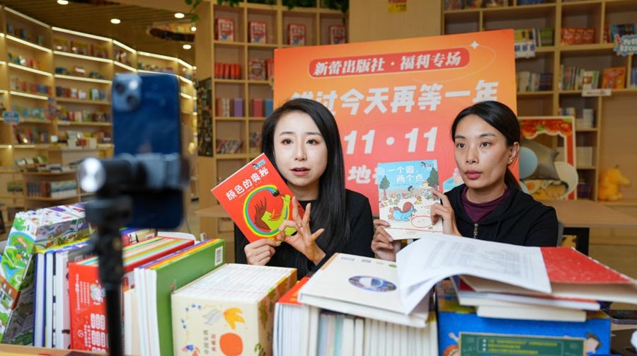 Women sell books via livestreaming at a reading space in north China's Tianjin, Nov. 11, 2024. (Xinhua/Sun Fanyue)