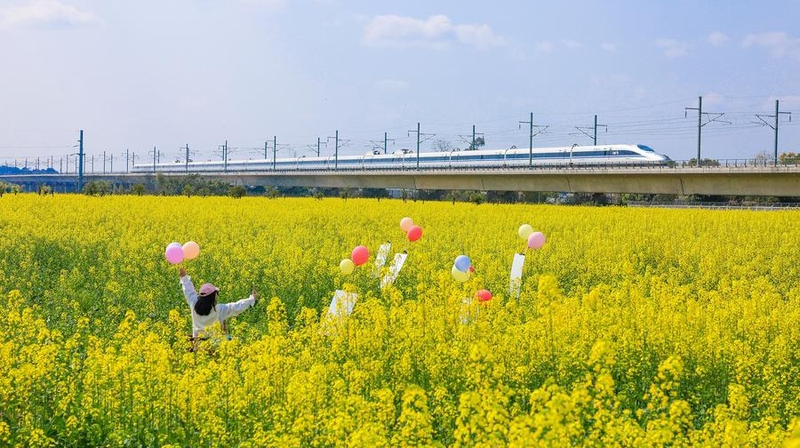 A tourist visits a rapeseed flower field as a high-speed train runs past in Longmatan district of Luzhou, Sichuan province, on Feb. 26, 2026. [Photo/Xinhua]