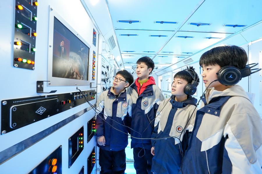 Students visit a mock space capsule at an aerospace science education center during the spring break in Sheyang County of Yancheng, east China's Jiangsu Province, April 1, 2026. [Photo/Xinhua]