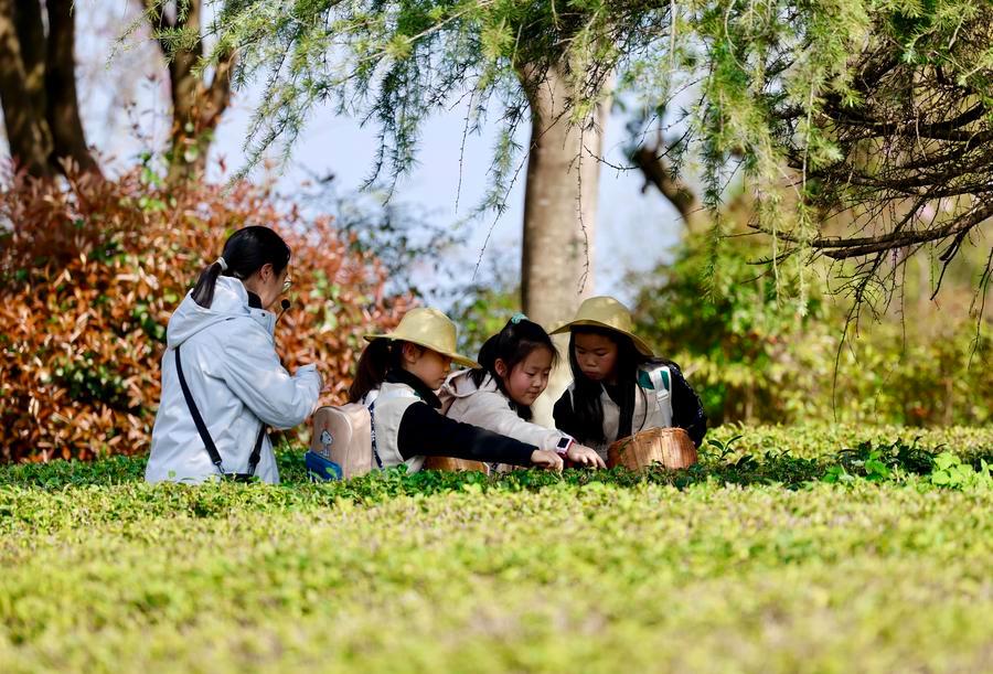 Students pick tea leaves at a tea garden during the spring break in Huangshan City, east China's Anhui Province, April 1, 2026. [Photo/Xinhua]